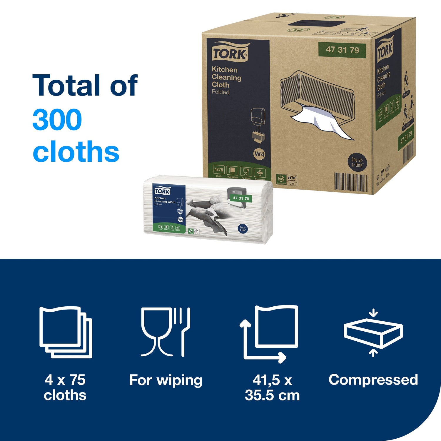 Tork Kitchen Cleaning Cloth White W4, Highly Absorbent, 4 x 75 Cloths, 473179
