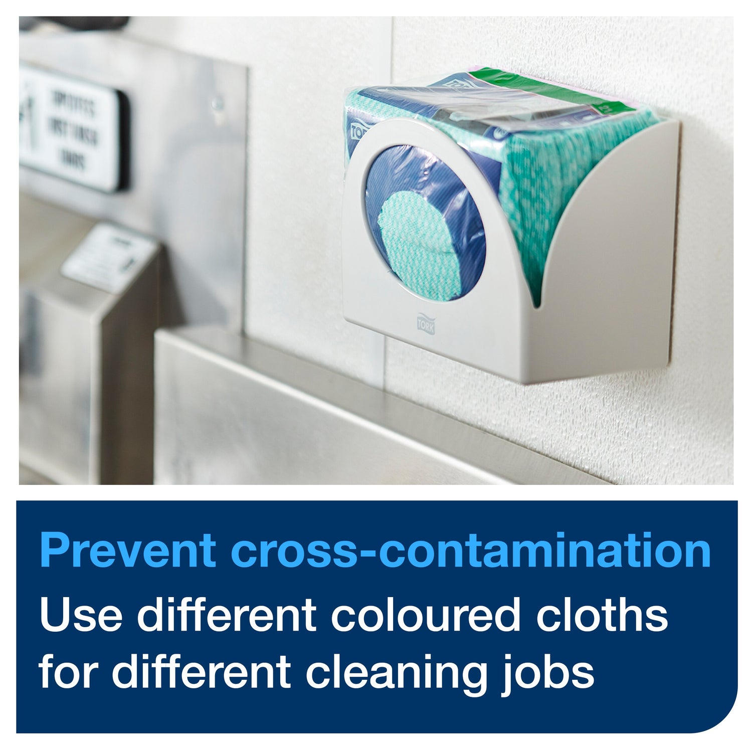 Tork Long-Lasting Cleaning Cloth W8: Using a cloth repeatedly can cause tearing, but our durable and absorbent cleaning cloths can be used again and again to prevent waste and lower costs. Use different-coloured cloths for different cleaning tasks to avoid cross-contamination – choose from blue, green, yellow or red. These cloths are suitable for use with most solvents, disinfectants and detergents, so you won't have to alter your cleaning routine. Use with Tork W8 Small Pack dispensers.