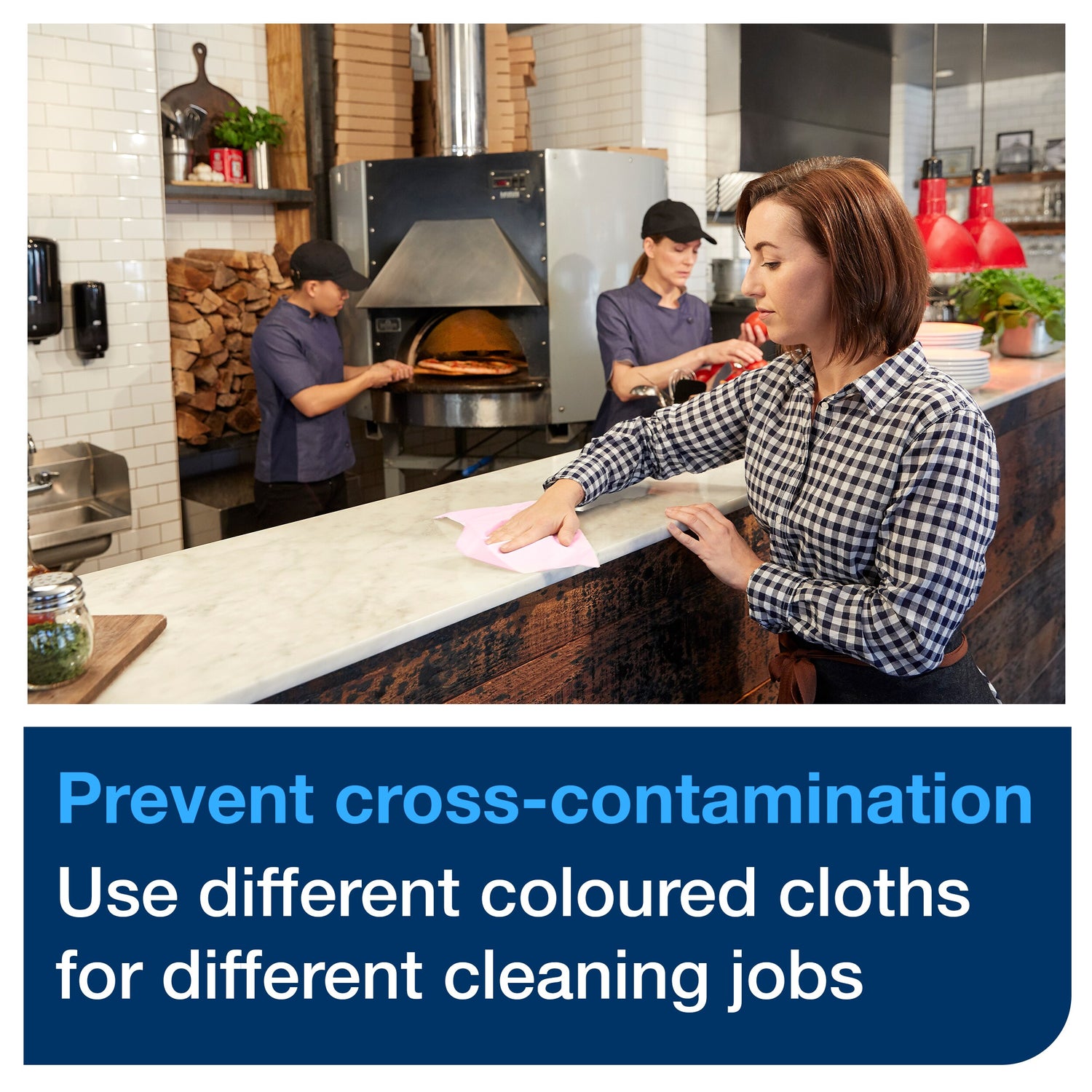 - Prevent cross-contamination by using different-coloured cloths for different jobs.