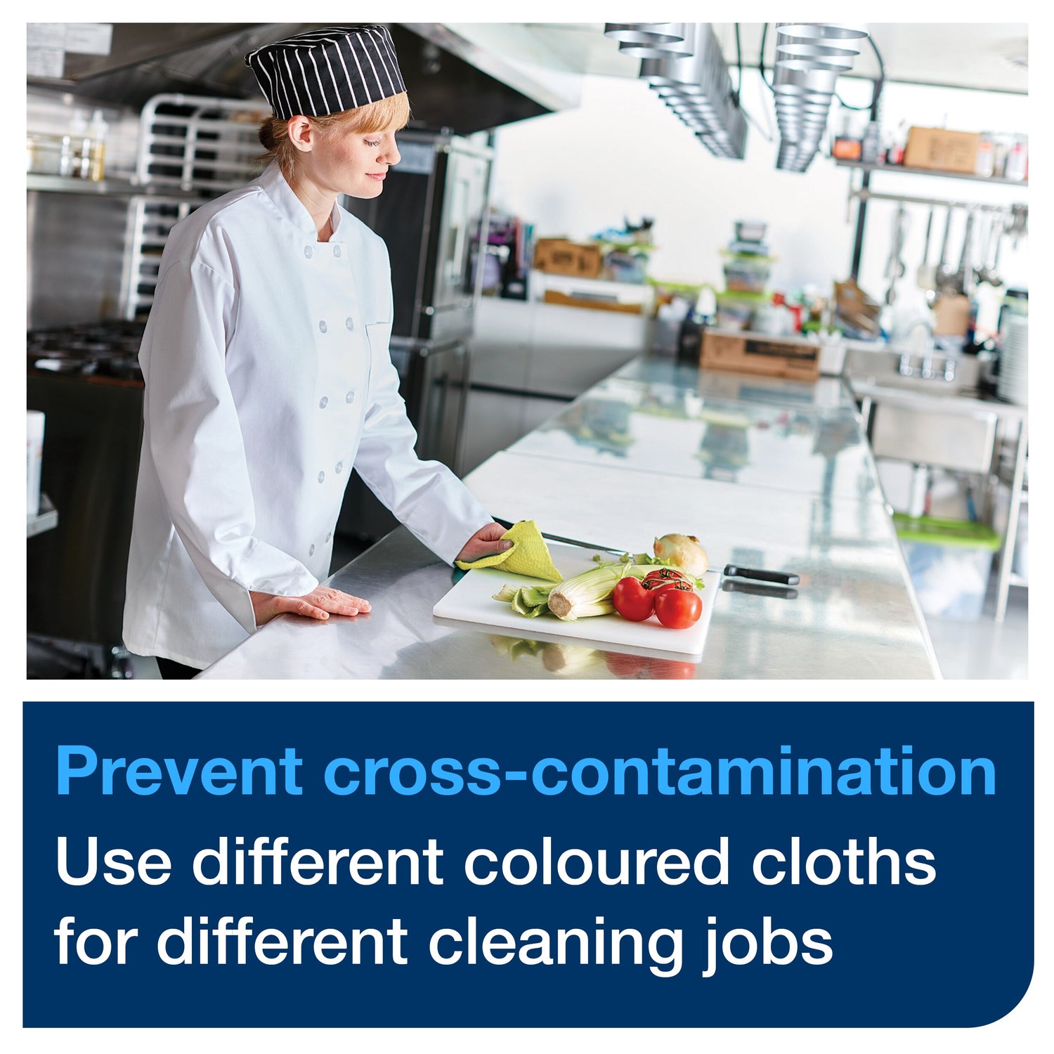 - Prevent cross-contamination by using different-coloured cloths for different jobs.