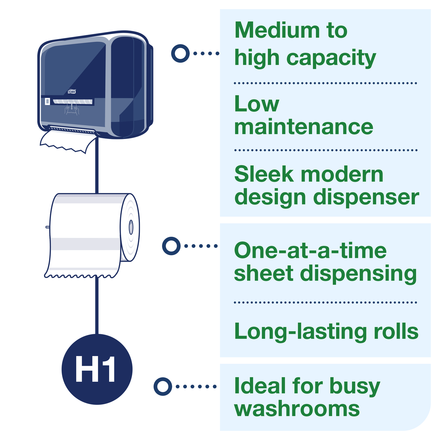 - Boost hygiene with one-at-a-time dispensing – the customer only touches the hand towels they need, rather than the dispenser.