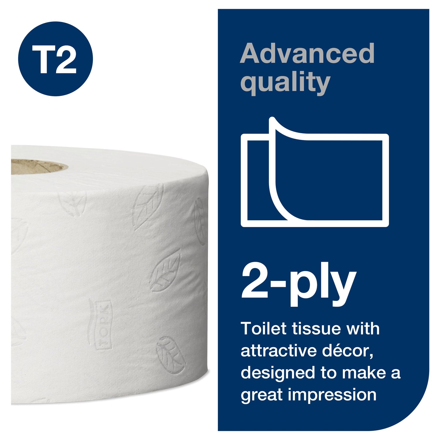 Tork Mini Jumbo Toilet Paper Roll White T2: Refilling empty toilet roll dispensers can be costly. Our Tork Mini Jumbo system is an efficient solution for medium to high-traffic spaces. The jumbo toilet roll offers far more paper than standard rolls, so there's less maintenance time and less chance of run-outs. This bulk toilet paper comes with an improved performance and sustainable certifications to boost your reputation. Plus, it comes in our Tork Easy Handling® Plastic Packaging, which makes roll transportation and package disposal simple.