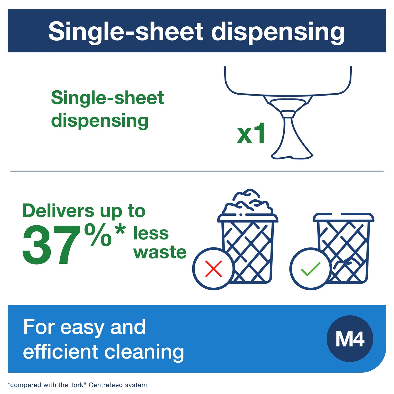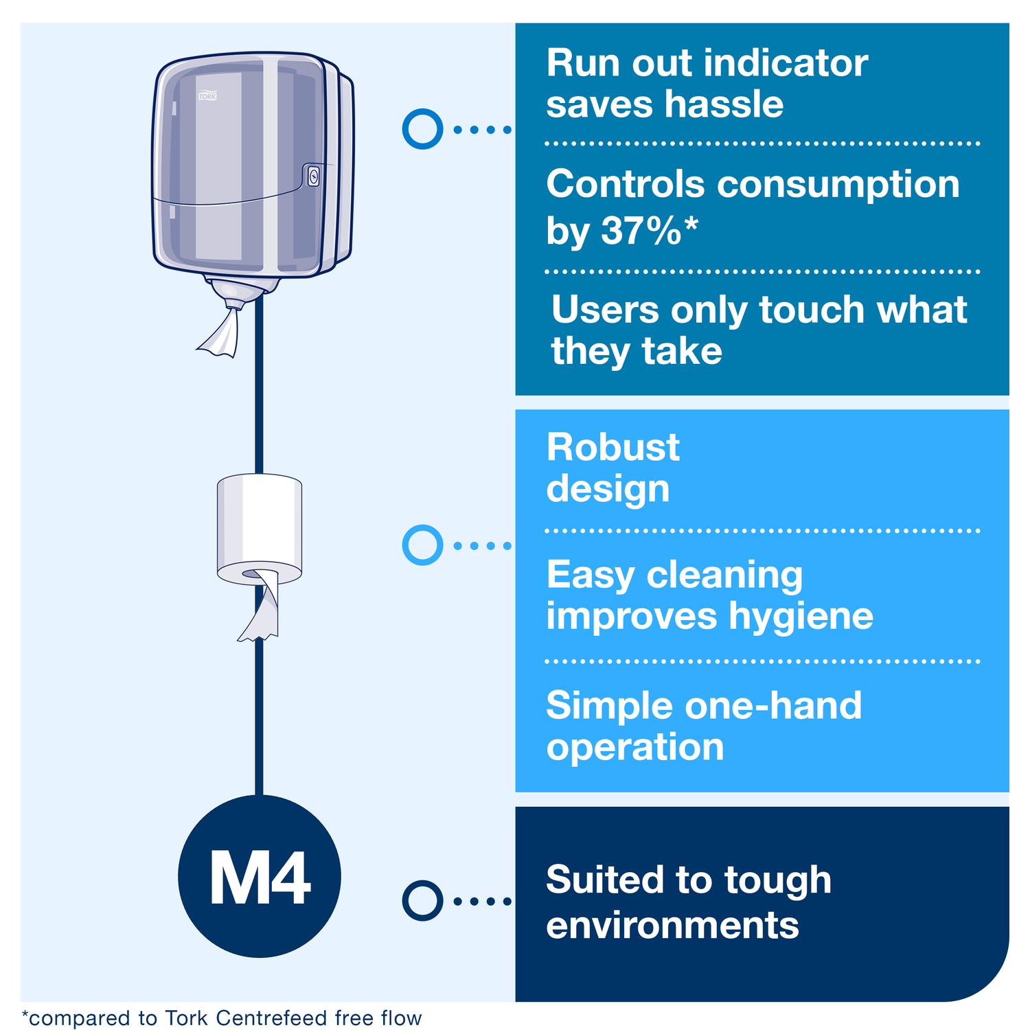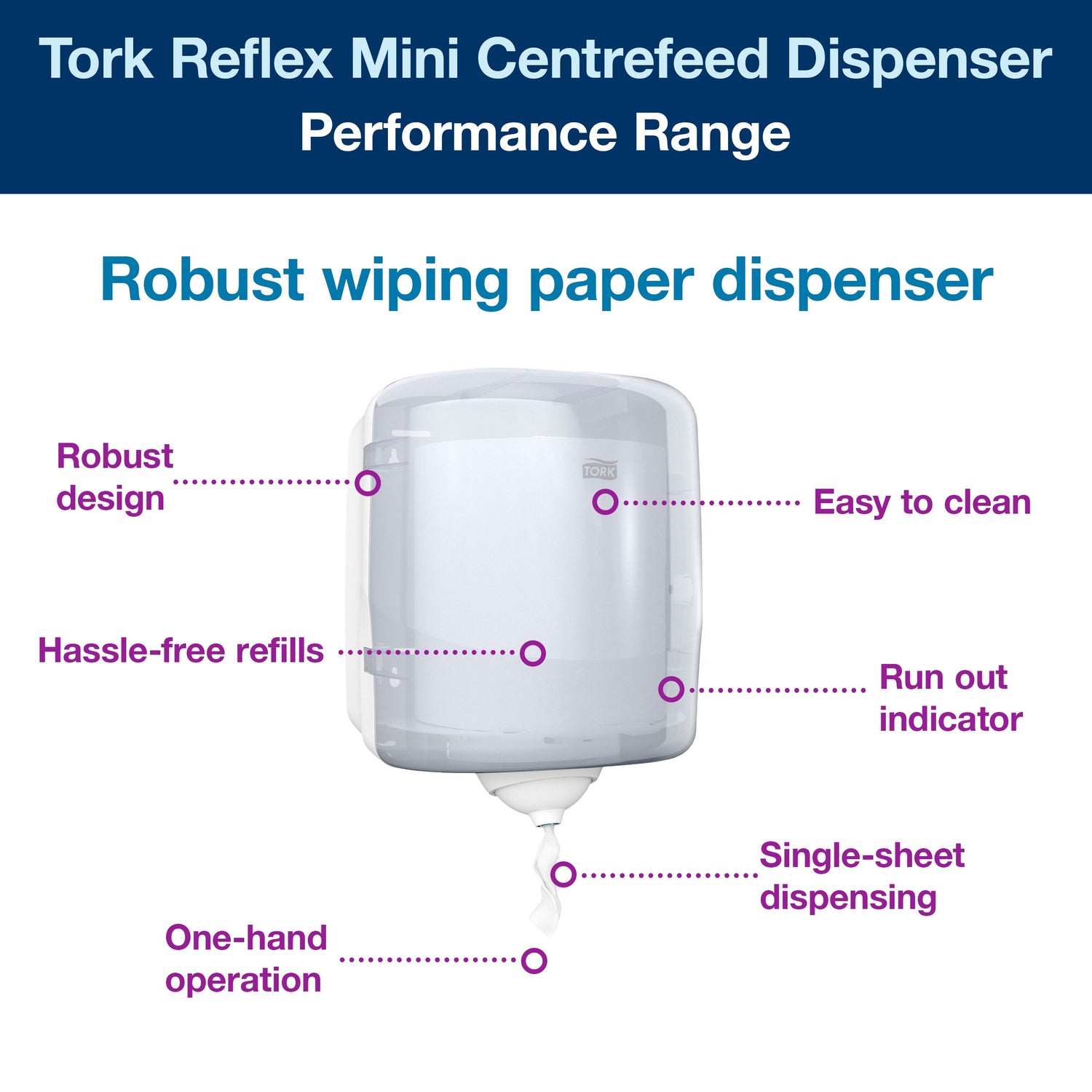 Tork Reflex™ Centrefeed Dispenser M4: Busy workspaces need robust equipment that easily fits into their existing workflow. Our durable Tork Reflex™ Centrefeed dispenser will slot into any professional space with a rotating nozzle for easy access to wiping paper. Hygiene is assured when cleaning hands and surfaces, thanks to single-sheet dispensing that means users touch only what they take. This dispenser also keeps waste levels under control, reducing consumption by up to 37% compared with the Tork® Centrefeed system. Carbon neutral - produced with certified renewable electricity and compensated with climate projects.